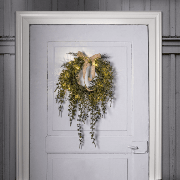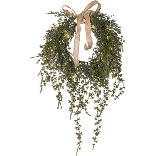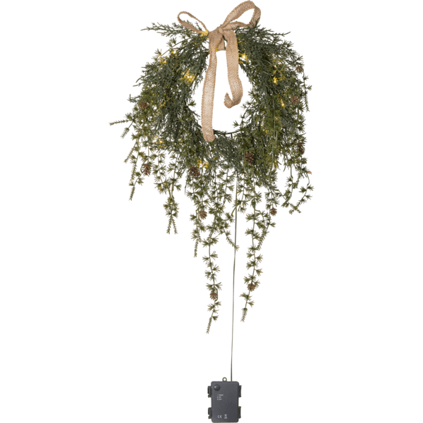 Männynkäpyseppeleessä on pitkät ja kaarevat oksat, jotka on valmistettu PE-materiaalista, mikä on ympäristöystävällinen valinta. 20 lämpimän valkoisen valopisteen ansiosta sitä voidaan käyttää sekä ovensuojuksena ulkona että seinäsuojuksena sisällä. Lisäkoristeena tässä kranssissa on myös juutista valmistettu rusetti. Köynnössilmukka saa virtansa kolmella AA-paristolla ja siinä on myös ajastintoiminto (6 h päällä, 18 h pois päältä, toistuva). Kun kytkin on päällä, ajastintila valaisee köynnöksen noin 30 päiväksi. Paristot eivät sisälly hintaan. Mukana 50 cm:n johto paristokoteloon.