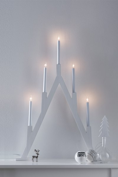 Marksløjdin Bjurfors-kynttilänjalka yhdistää suoria muotoja klassiseen muotoiluun. Jalusta valkoista puuta ja valkoisia muovikynttilöitä. Aseta se ikkunalle tai olohuoneen sivupöydälle ja luo kaunis joulutunnelma. Mukana 2 metrin valkoinen muovijohto, virtakytkin ja pistoke. Mukana 5 vaihdettavaa E10-polttimoa 55 V:lla.