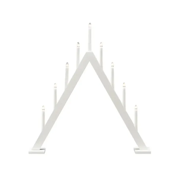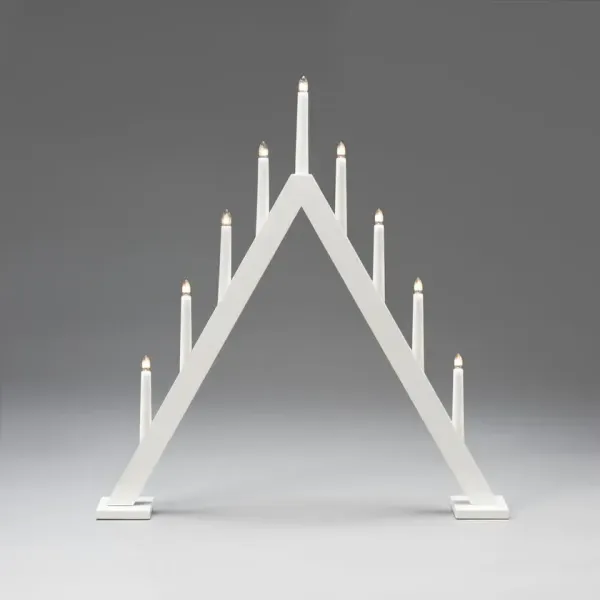 Luo tyylikäs ja moderni joulutunnelma tällä tyylikkäällä valkoiseksi lakatulla puulla valmistetulla adventtikynttilänjalalla. Klassinen pyramidimuoto on yhdistetty minimalistiseen muotoiluun, mikä tekee siitä täydellisen sisustusyksityiskohdan sekä perinteisiin että moderneihin koteihin. Yhdeksän kynttilää levittävät lämmintä ja tunnelmallista hehkua – ajaton suosikki, joka valaisee adventtikauden! Mukana 1,7 metrin valkoinen johto, virtakytkin ja pistoke. Sisältää 9 vaihdettavaa E10-lamppua (23V).