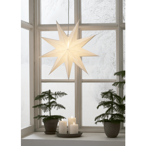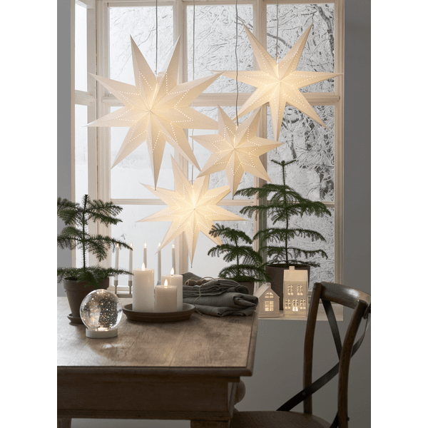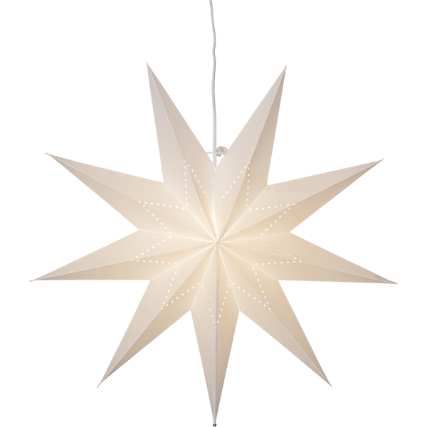 Valkoinen paperitähti, jossa on tähdenmuotoinen helmikuvio. Koristele jouluksi ja adventiksi. Ripusta yksi tai useampi tähti ikkunaan tai seinää vasten. Mukana 3,5 m valkoinen johto ja pistoke. Valonlähde ei sisälly toimitukseen.