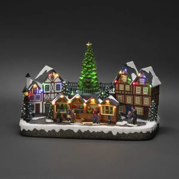 Luo elävä talven ihmemaa kotiisi näillä mekaanisilla joulumarkkinoilla! 28 lämpimän valkoisen LED-valon, katettujen talojen, värikkäiden kauppakojujen ja keskellä olevan valtavan joulukuusen ansiosta se levittää sekä valoa että musiikkia. Tunnelmallinen koriste, joka tuo mieleen klassisen joulun taian! Toimii 3xAA-paristolla (1,5V – ei sisälly). Mukana muuntaja 1,8 metrin mustalla johdolla ja pistokkeella. Integroitu LED-valaistus.
