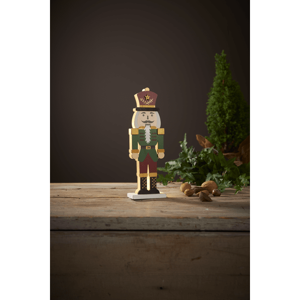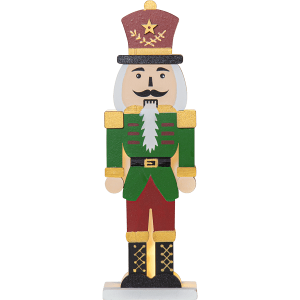 Tyylikäs laserleikatusta puusta valmistettu pähkinänsärkijä, jonka etupuoli on maalattu punaiseksi, vihreäksi, kultaiseksi ja mustaksi. Pienet LED-valot loistavat kahden palapelin muotoisen siluetin välissä, toinen edessä ja toinen takana. Koristele pähkinänsärkijällä pöydällä tai hyllyllä jouluksi ja adventiksi. Varustettu ajastimella, 6 tuntia päällä, 18 tuntia pois päältä, toistuva. Virtalähteenä 2 AAA-paristoa, eivät sisälly toimitukseen.