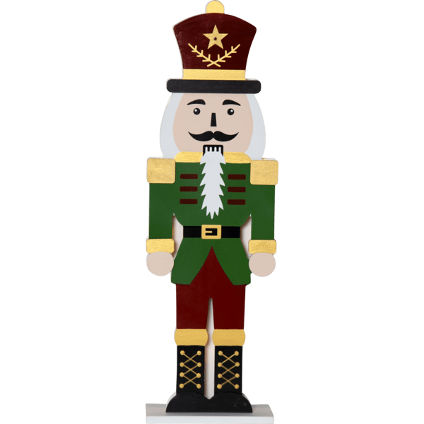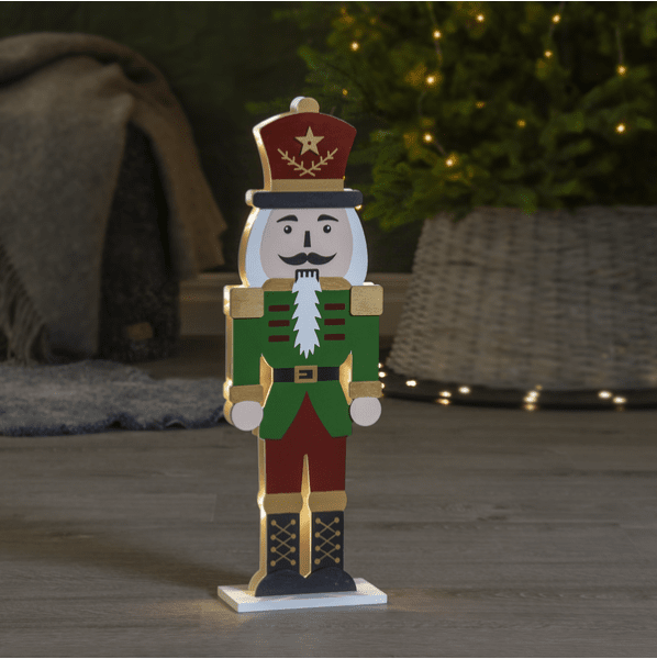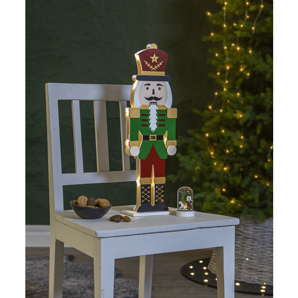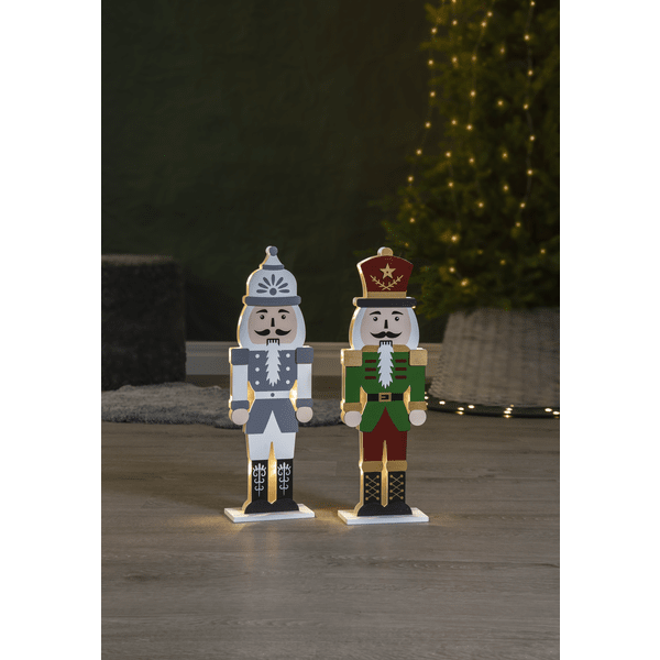 Tyylikäs pähkinänsärkijä laserleikatusta puusta, etupuoli on maalattu punaiseksi, vihreäksi, kultaiseksi ja mustaksi. Pienet LED-valot loistavat kahden palapelin muotoisen siluetin välissä, toinen edessä ja toinen takana. Koristele pähkinänsärkijällä pöydällä tai hyllyllä jouluksi ja adventiksi. Varustettu ajastimella, 6 tuntia päällä, 18 tuntia pois päältä, toistuva. Virtalähteenä 2 AA-paristoa, eivät sisälly toimitukseen.