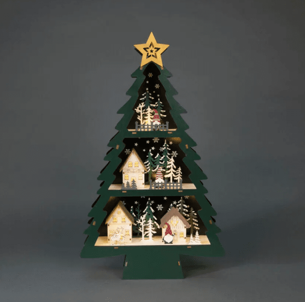 Kaunis koristelu kokonaan puusta tehdyn joulukuusen muodossa. Sisäänrakennettu integroitu valaistus lämpimän valkoinen hehku luo lämpimän ja kodikkaan tunnelman huoneeseen. Toimii kahdella AA-paristolla (ei mukana) tai mukana tulevalla USB-kaapelilla. 180 cm. Puu on varustettu myös ajastintoiminnolla 6h.